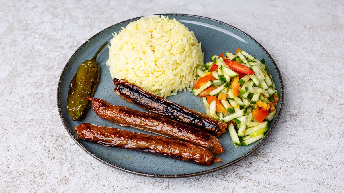 230 גרם בורגר עסיסי בלחמנייה טרייה, עם רוטב הבית, חסה, חמוצים, בצל ועגבנייה. מעל הבורגר: נקניקיות מרגז חריפות.