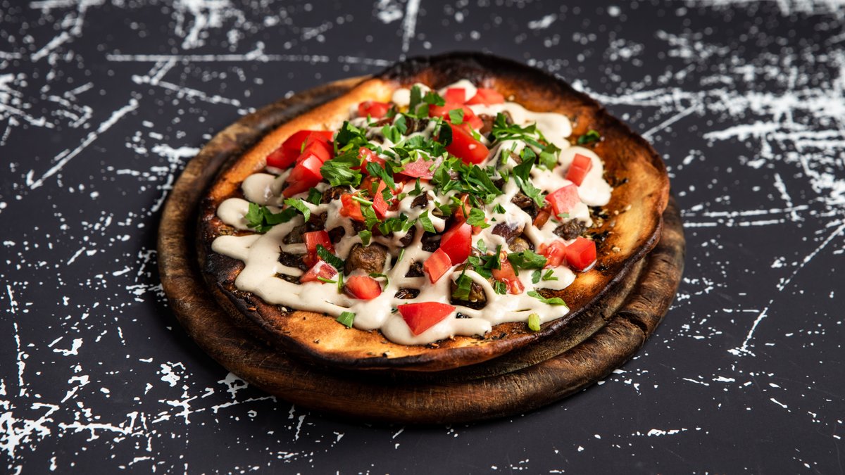 פטריות, עגבנייה ובצל אפויים על בצק וטחינה