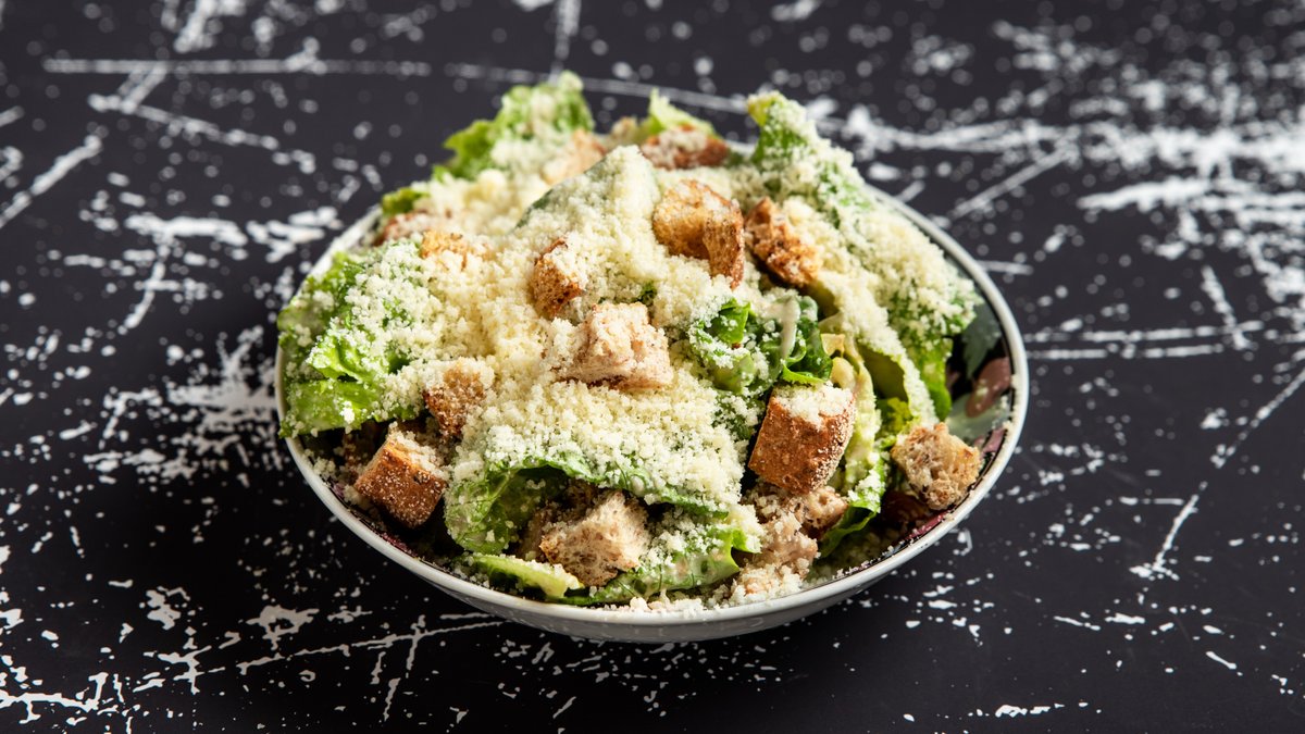 לבבות חסה, רוטב קיסר, בצל סגול, קרוטונים, ביצה קשה ופרמז׳ן