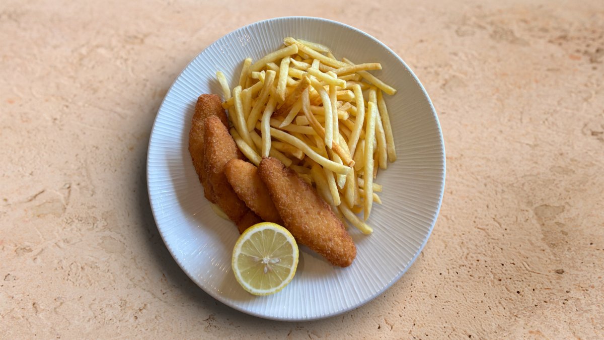 דג לבן בפירורי לחם מוגש עם צ׳יפס הבית