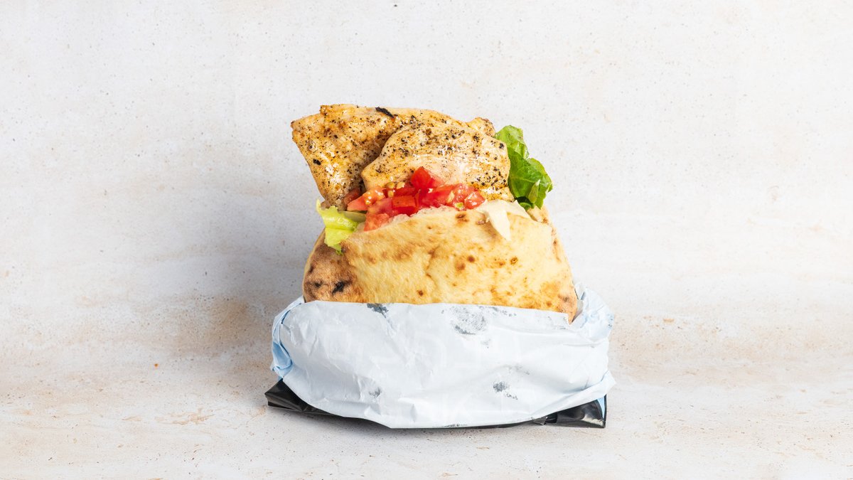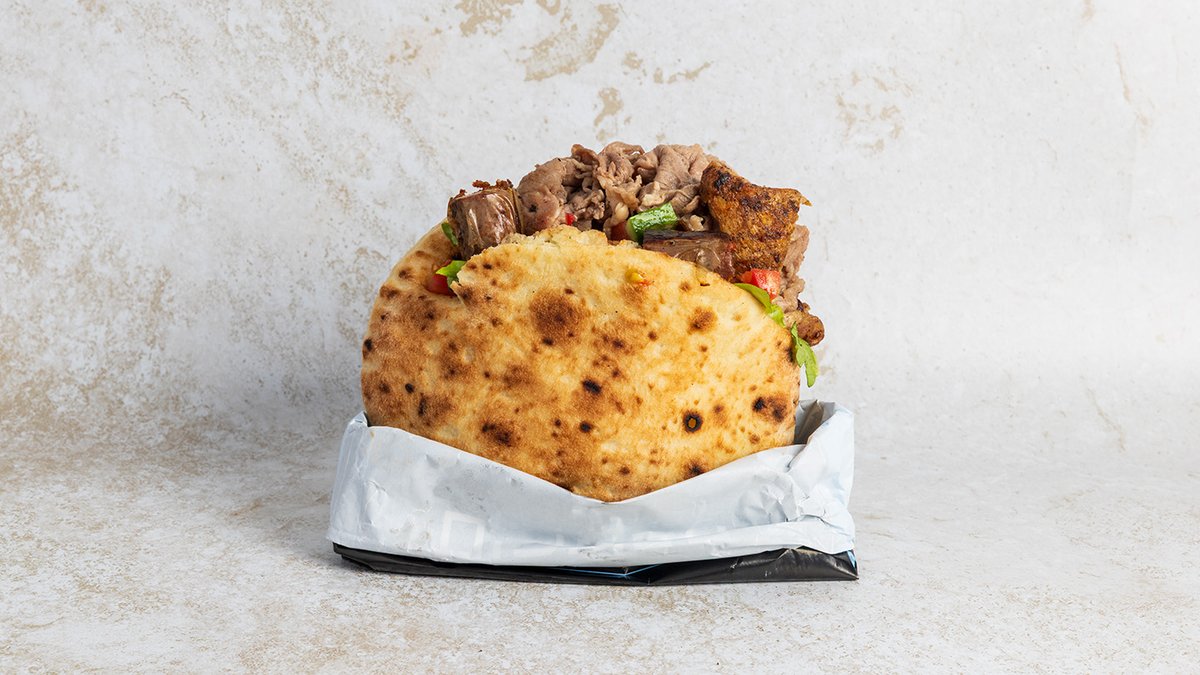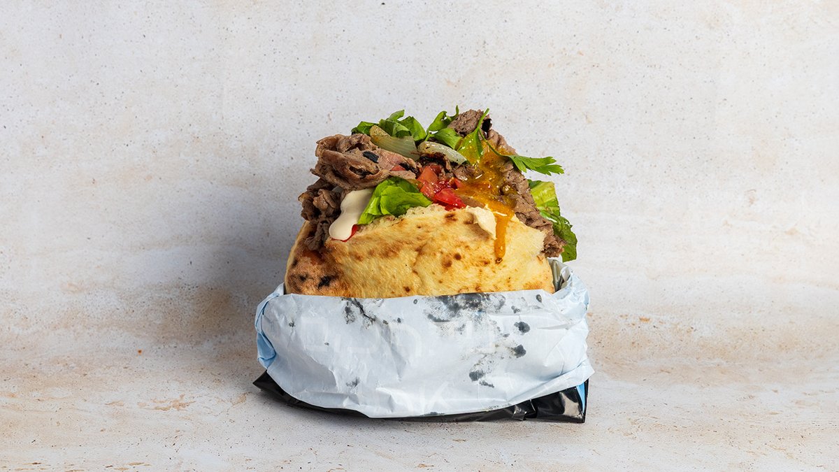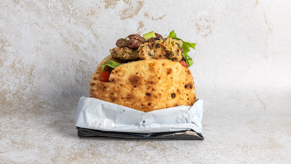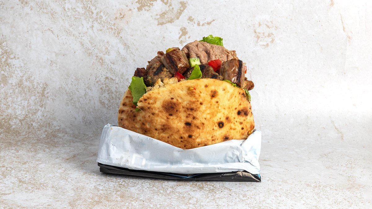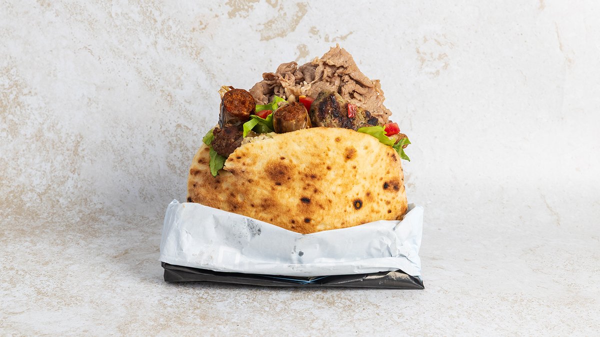 ממרחים, סלטים ותוספת לבחירה מוגש עם ירקות מדורה מוגש ללא צ׳יפס, התמונה להמחשה בלבד