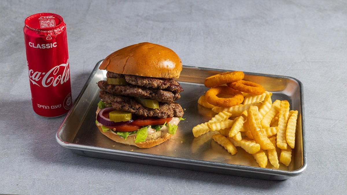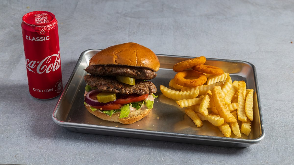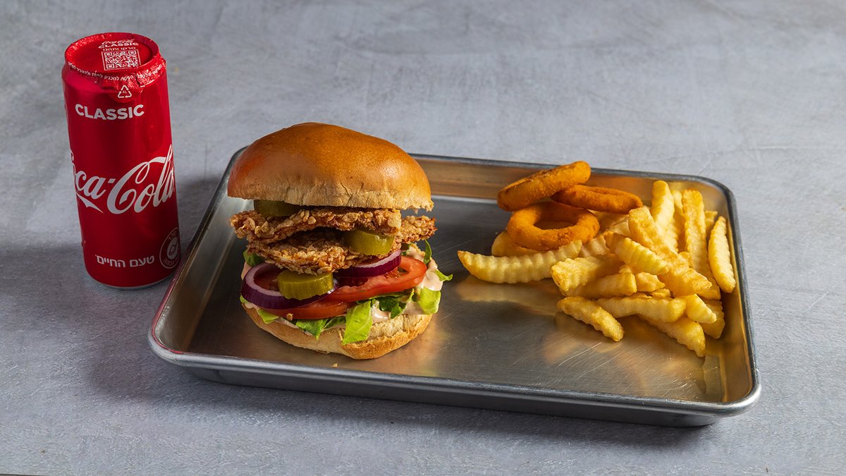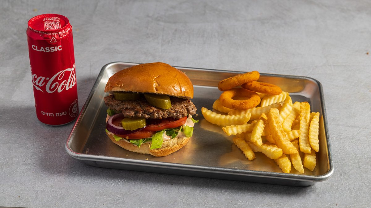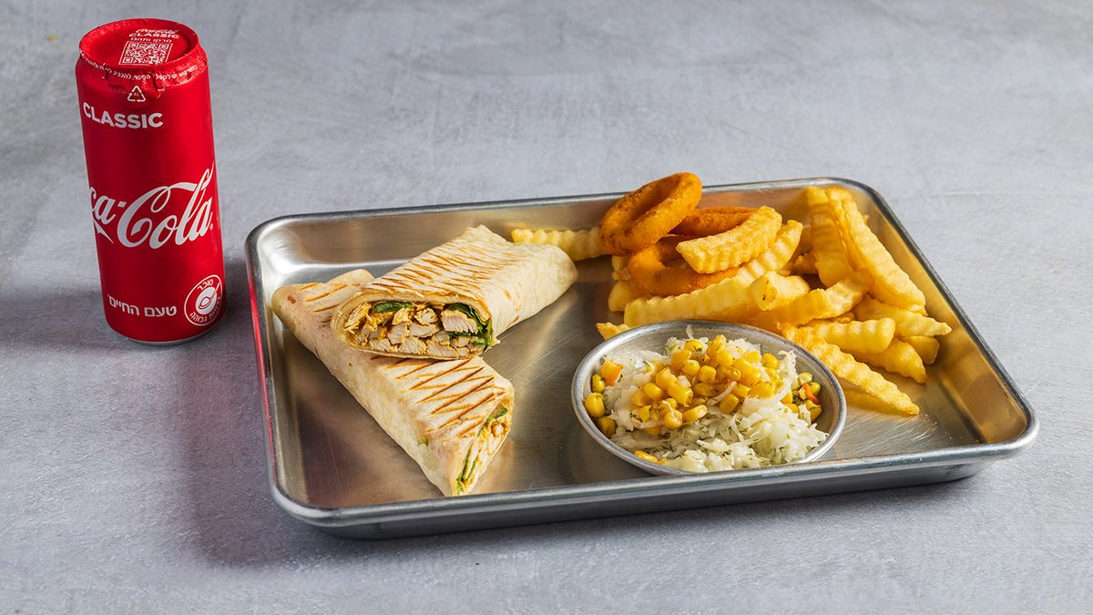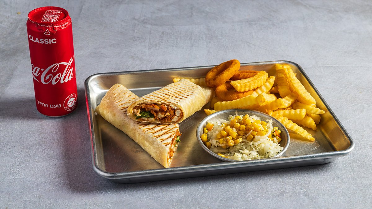 מוגש עם צ׳יפס, 3 טבעות בצל ושתיה לבחירה