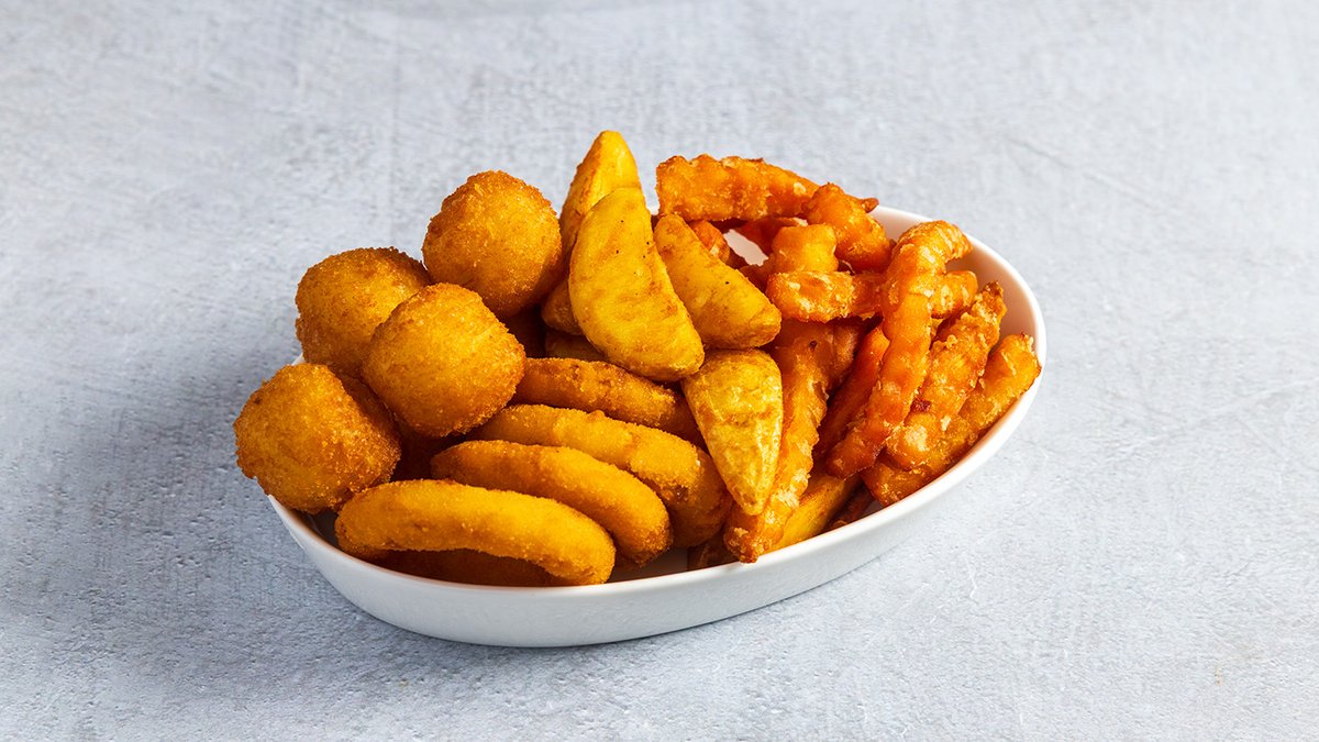 פירה, טבעות בצל, פוטטוס, צ׳יפס בטטה | بطاطا مهروسة، حلقات بصل، بطاطا ودجز، بطاطا حلوة مقلية