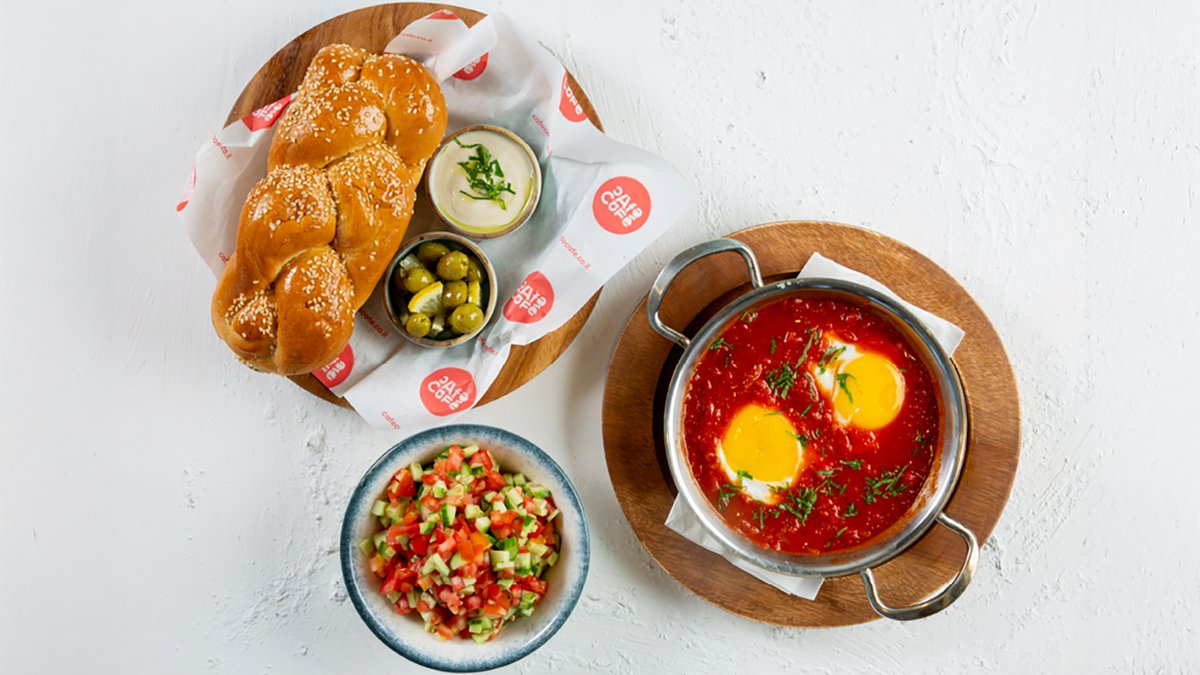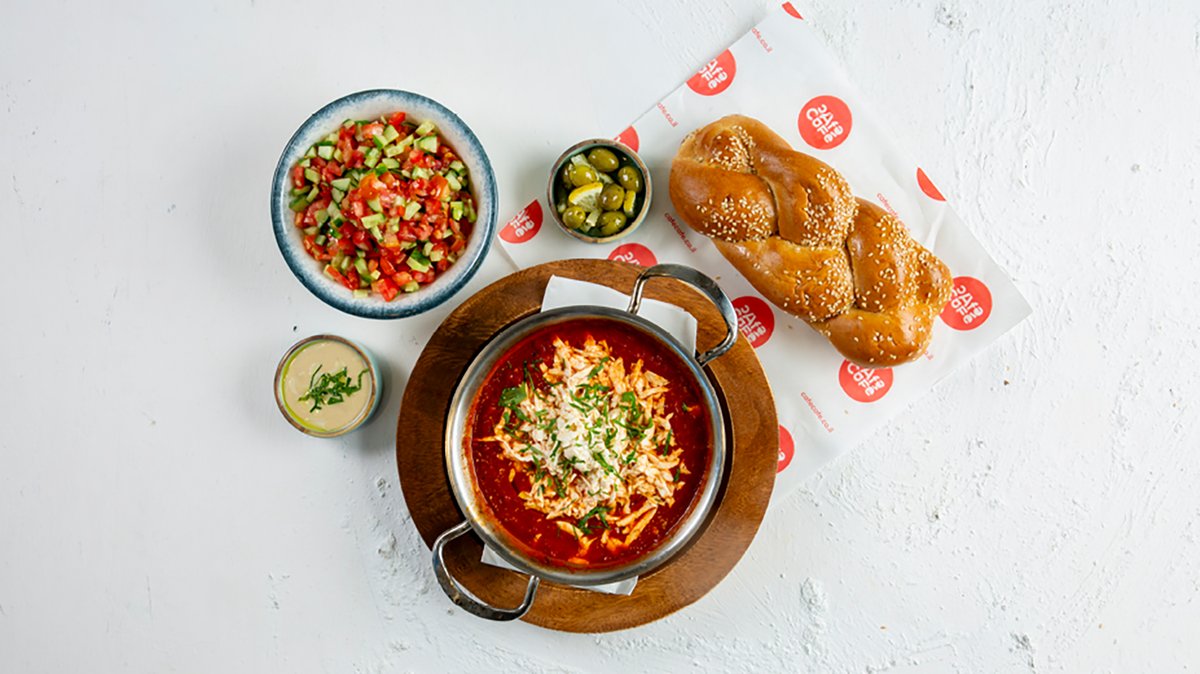 תבשיל עגבניות פיקנטי, פלפלים אדומים, בצל ושום, מוגש במחבת לוהטת עם שתי ביצי משק, לצד סלט אישי, חלה מתוקה, טחינה וזיתי הבית