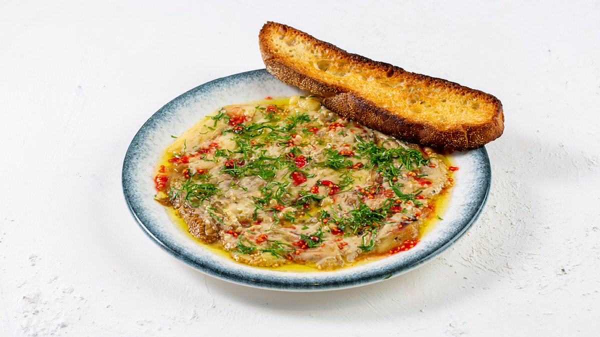 חציל שרוף באש גלויה, טחינה גולמית, סלסת עגבניות סילאן, פטרוזיליה, שברי אגוזי לוז פלפל צ'ילי חריף, וגרידת לימון. מוגש עם פלוט
