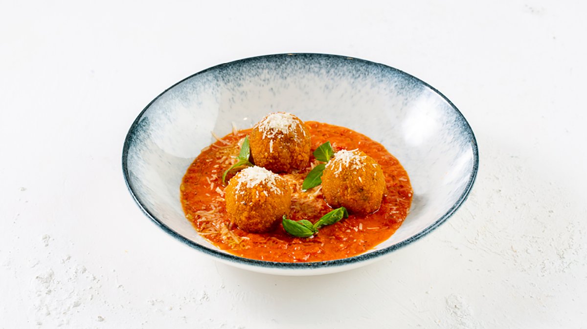 כדורי אורז פריכים במילוי מוצרלה פרסקה על מצע רוטב רוזה קטיפתי