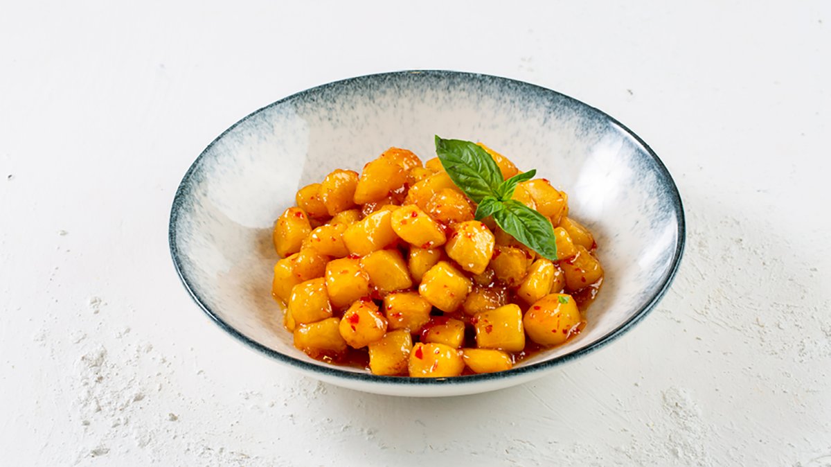 קוביות תפוח אדמה קריספי ברוטב צ'ילי, חמאה ונגיעות שמנת