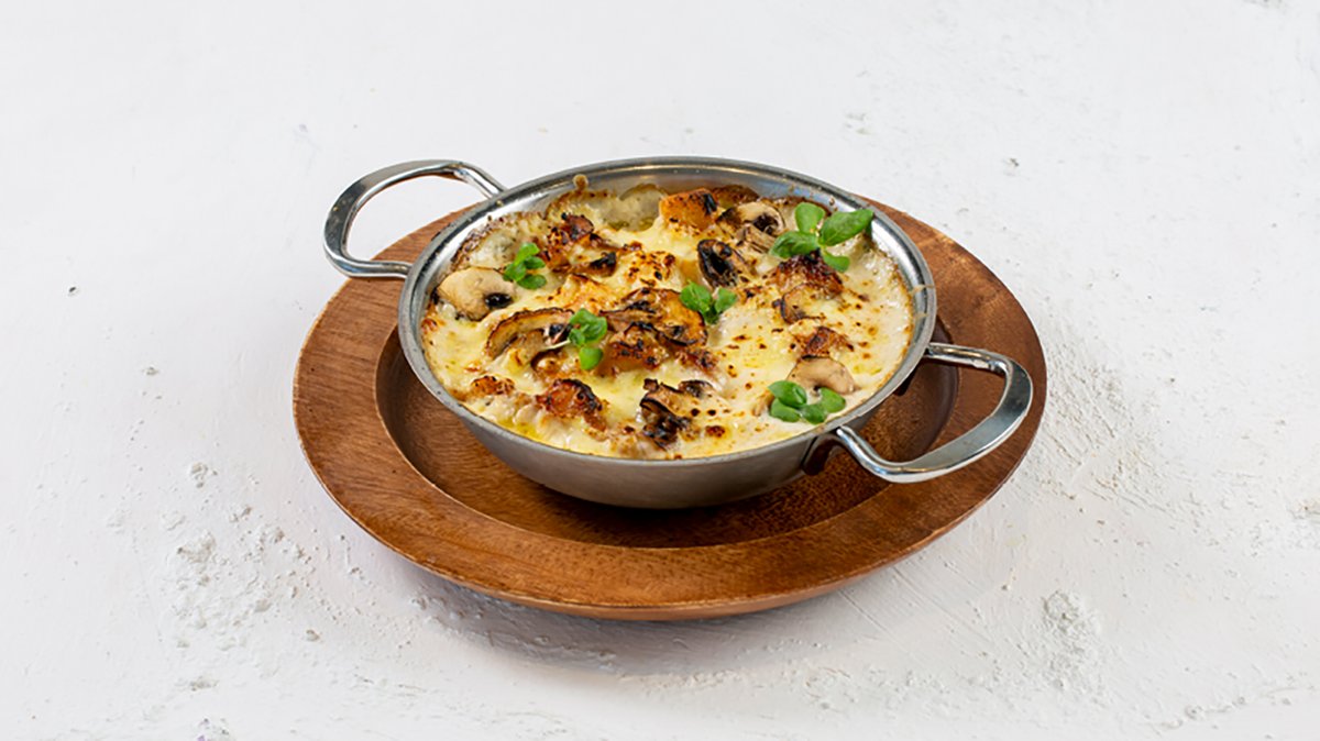 תפוח אדמה ברוטב שמנת, פטריות חתוכות ומיקס גבינות, מוגש עם פרמז'ן מגורד ועלים ירוקים