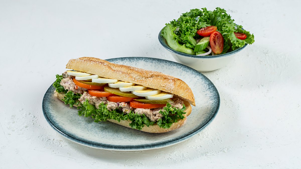 סלט טונה במיונז, ביצה קשה, מלפפון חמוץ, עגבנייה וחסה