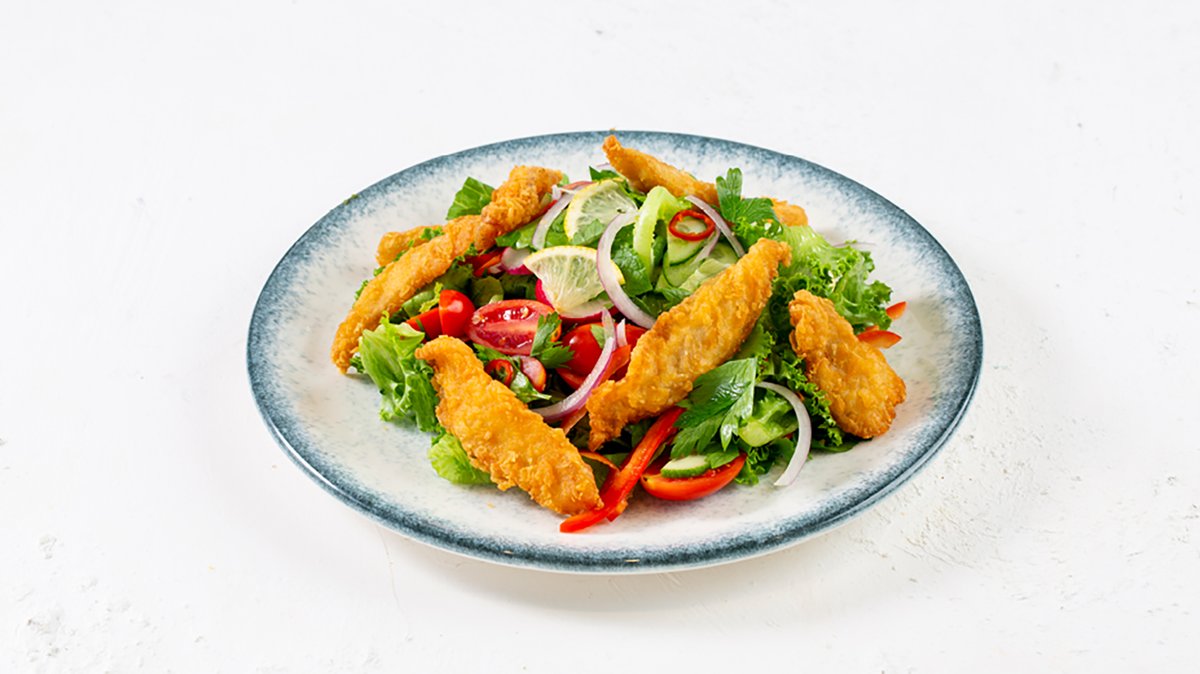 מיקס עשבי גינה וחסה, בצל סגול, צנונית, מלפפון, עגבניות שרי, רצועות פלפלים, פלפל חריף, פרוסות לימון, אגוזי לוז, שמן זית לימון ונתחי דג בטמפורה