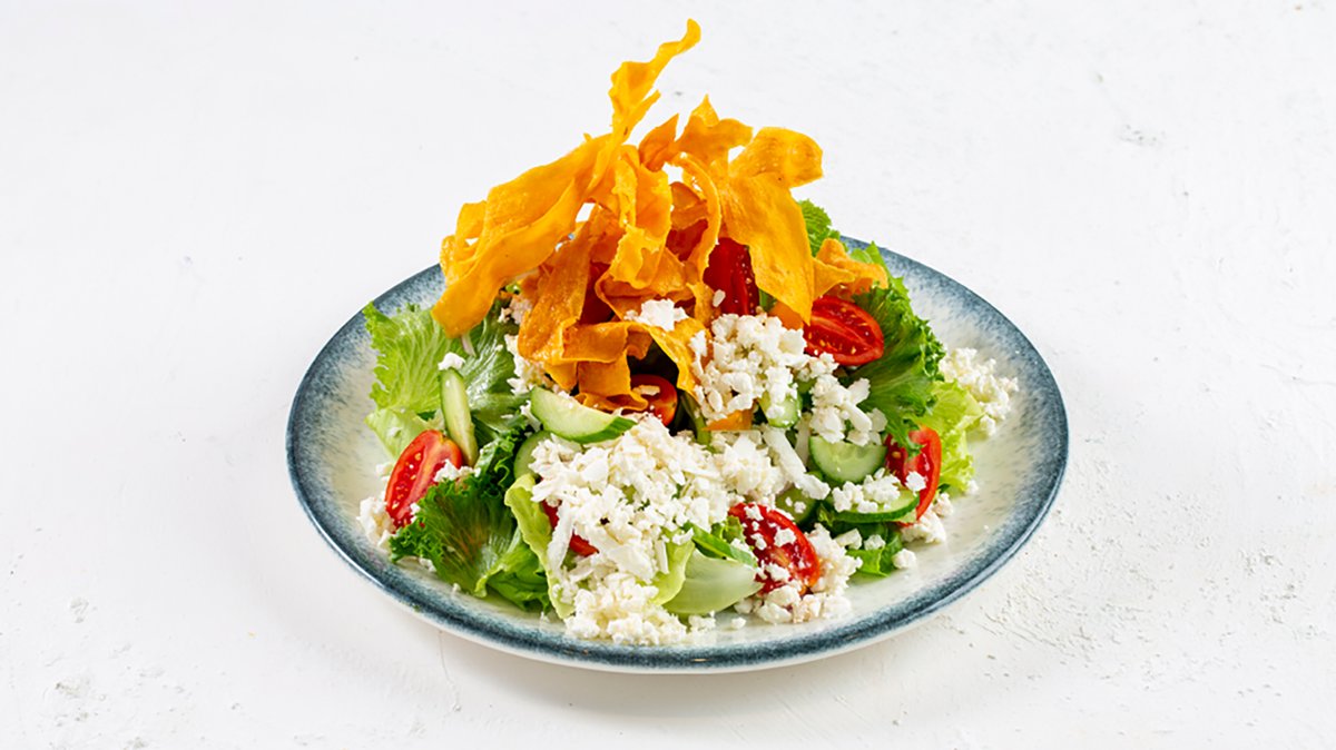 לקט חסות, עגבנייה, מלפפון, בצל, גבינת פטה, בתיבול שמן זית לימון ובטטה קראנץ'