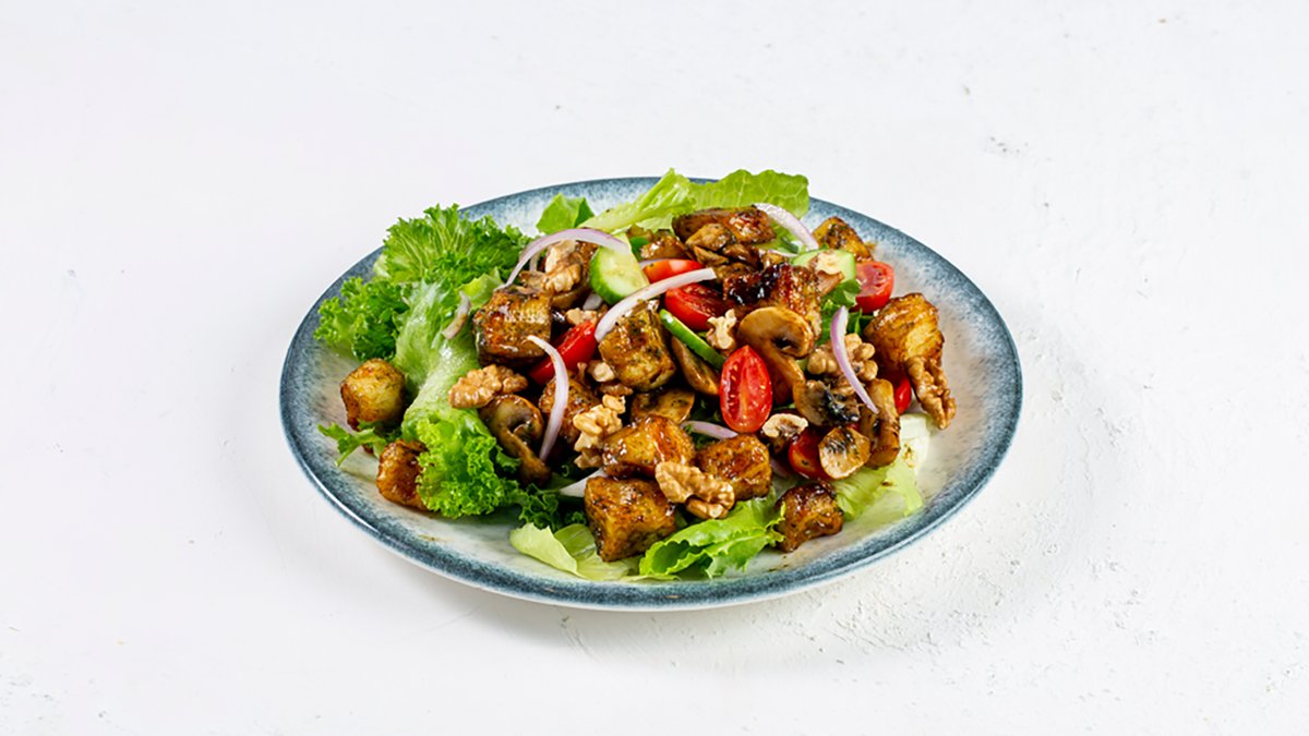 קוביות חלומי צרובות, מיקס חסות, פטריות שמפיניון צלויות ברוטב טריאקי, פסטו, עגבניות שרי, מלפפונים, בצל סגול, אגוזי מלך וויניגרט הבית