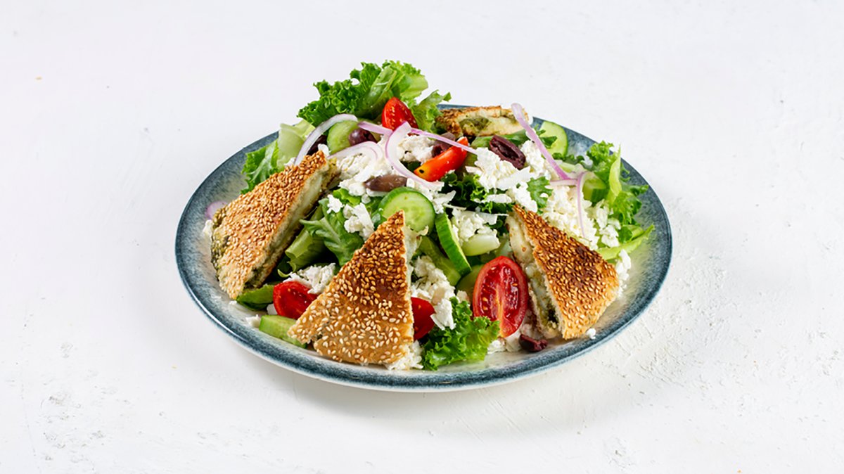 לקט חסות, מלפפון, עגבניות שרי, בצל סגול, זיתי קלמטה, שברי פטה, קוביות טוסט פסטו וגבינות, בליווי ויניגרט הבית (מוגש ללא לחם)