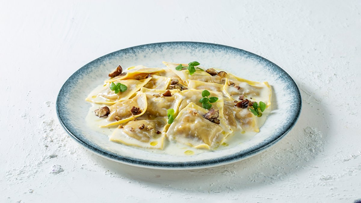 רביולי במילוי בטטה ברוטב שמנת, ערמונים ועלי בזיליקום.