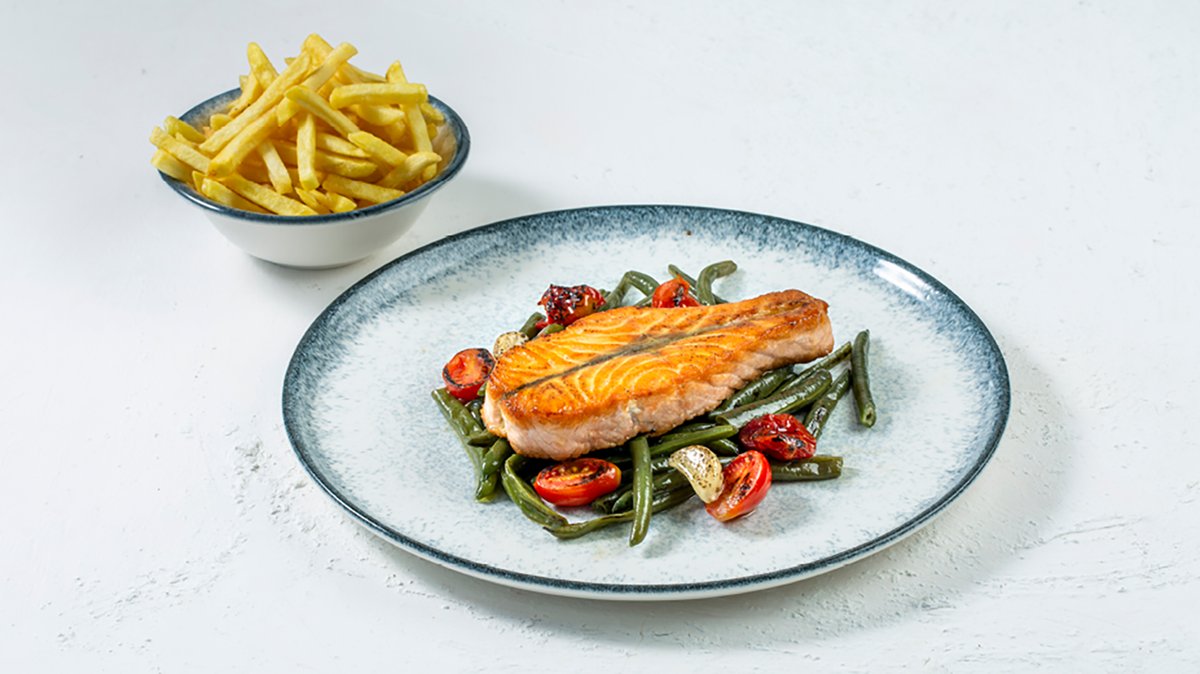 פילה סלמון על מצע שעועית ירוקה, סוכריות עגבניות שרי, שום קונפי רוטב הולנדייז ושמן בזיליקום