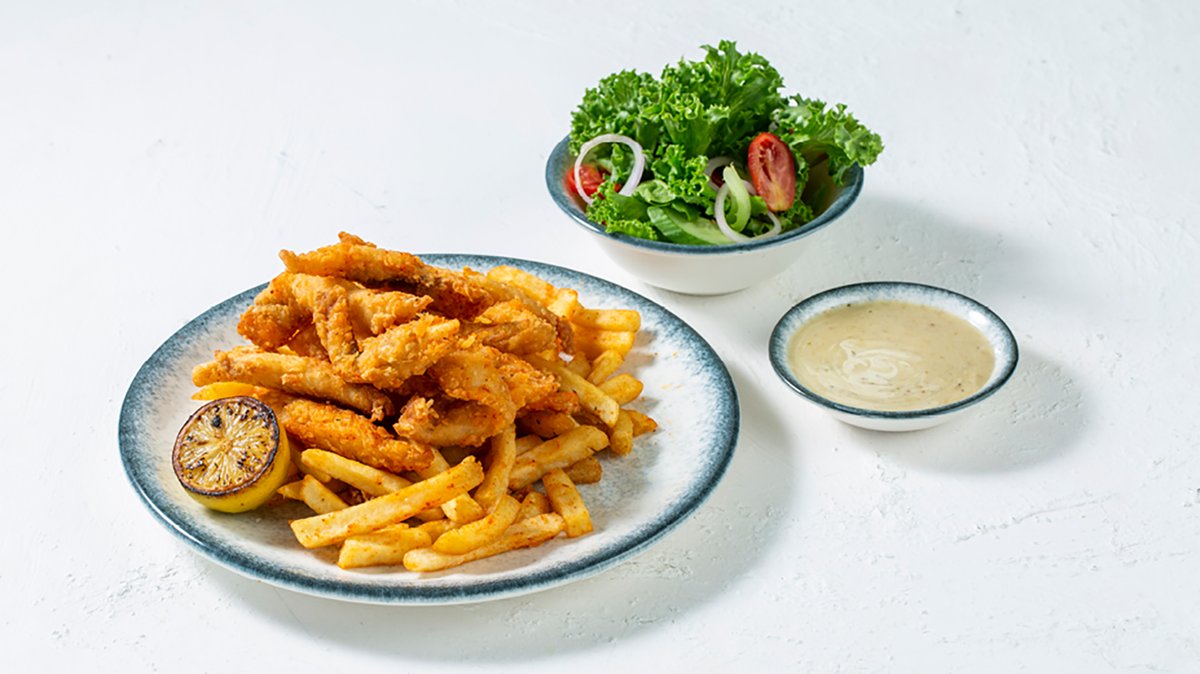 נתחי פילה דג ים בבלילת טמפורה עדינה מוגש לצד לימון, איולי חלפיניו וצ'יפס