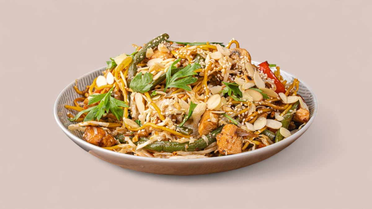 נתחי טופו, אורז | נודלס מוקפצים ברוטב אסיאתי ומבחר ירקות שוק, בעיטור בוטנים ושומשום קלוי
