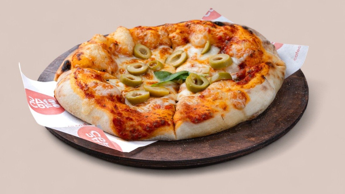 בצק דק ופריך, רוטב עגבניות, גבינת מוצרלה, גבינה צהובה וזיתים ירוקים