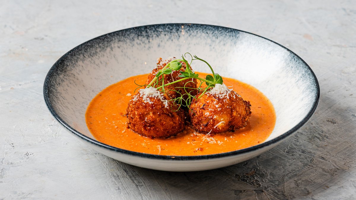 כדורי אורז פריכים במילוי מוצרלה פרסקה על מצע רוטב רוזה קטיפתי