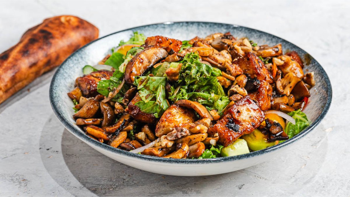 קוביות חלומי צרובות, מיקס חסות, פטריות שמפיניון צלויות ברוטב טריאקי, פסטו, עגבניות שרי, מלפפונים, בצל סגול, אגוזי מלך וויניגרט הבית