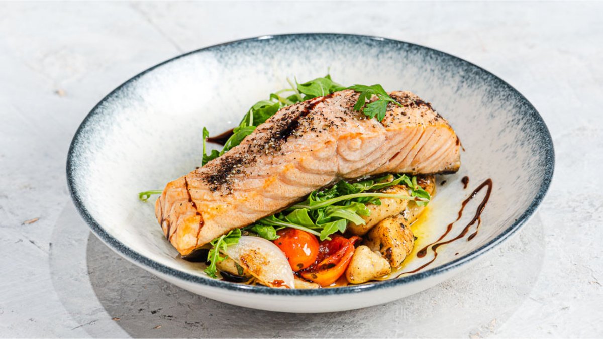 נתחי סלמון, שום קונפי, בצל סגול, ארטישוק, עגבניות מיובשות, זיתי קלמטה, צ׳ילי, שמן זית ועשבי תיבול