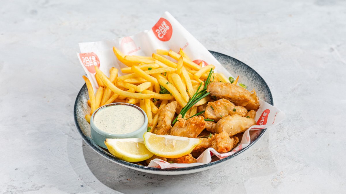 נתחי פילה דג ים בבלילת טמפורה עדינה מוגש לצד לימון, איולי חלפיניו וצ'יפס