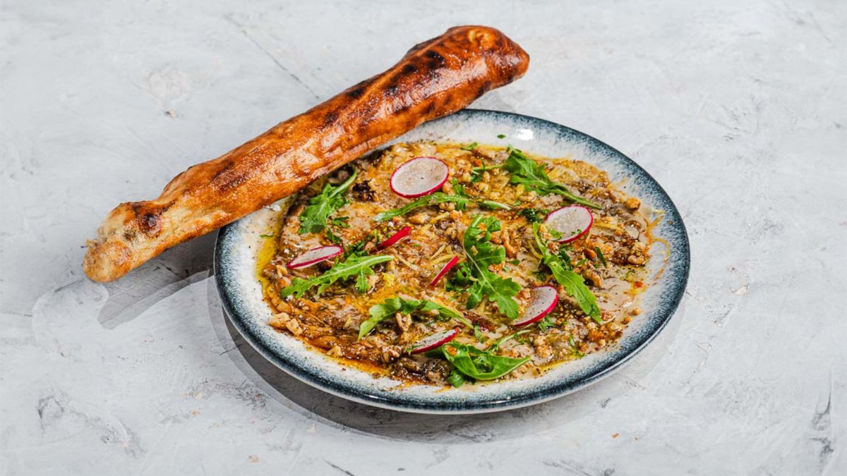 חציל שרוף באש גלויה, טחינה גולמית, סלסת עגבניות סילאן, פטרוזיליה, שברי אגוזי לוז פלפל צ'ילי חריף, וגרידת לימון. מוגש עם פלוט