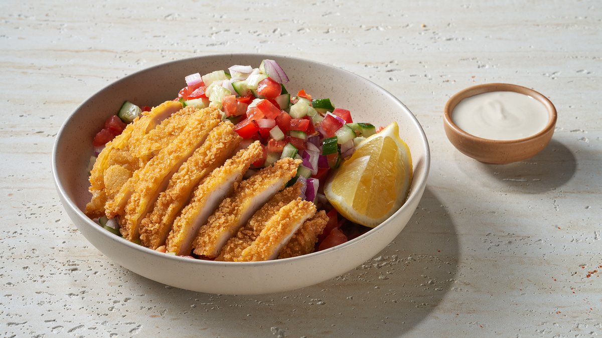 נתחי שניצל, עגבניה, מלפפון ובצל