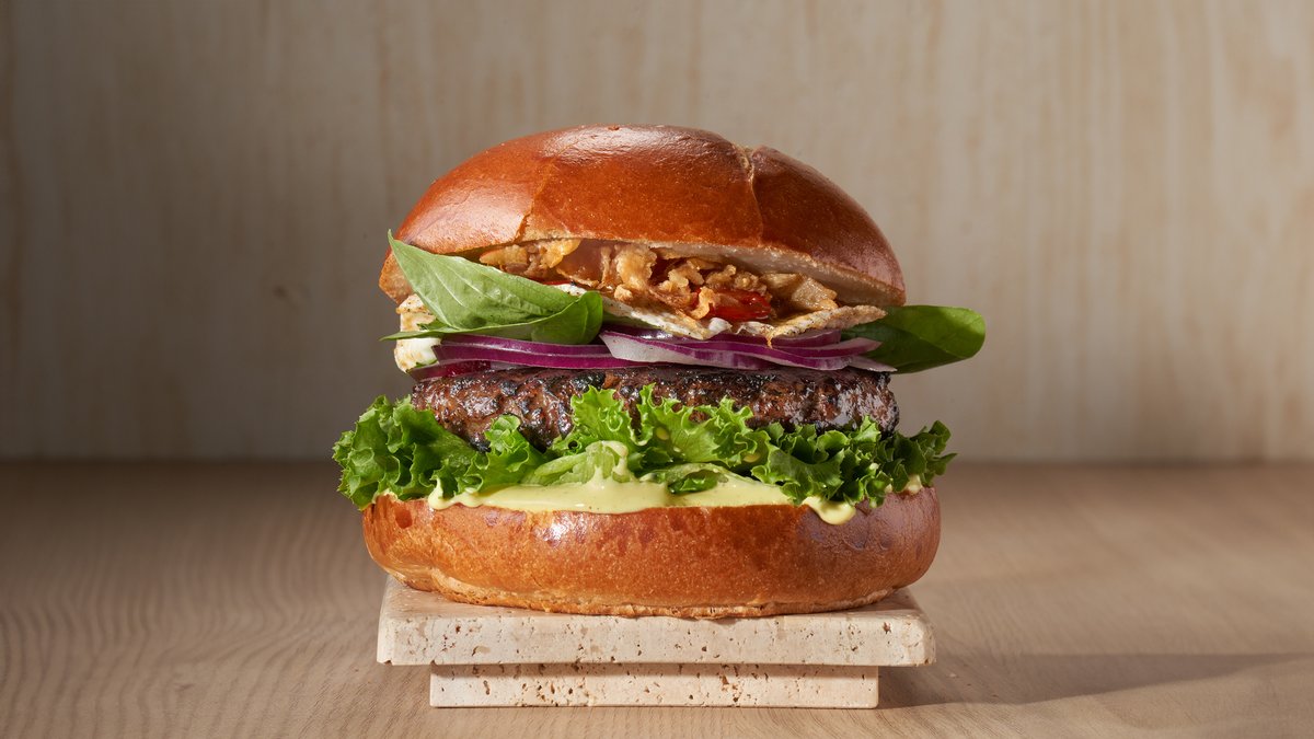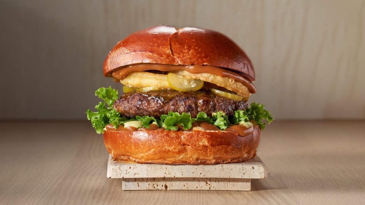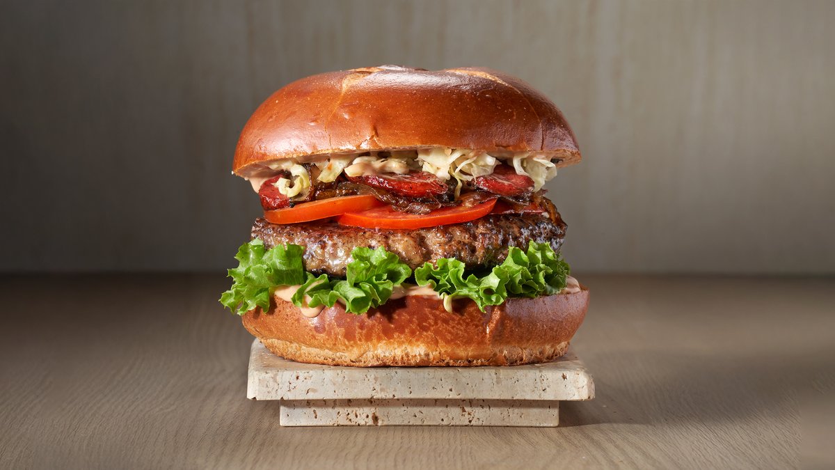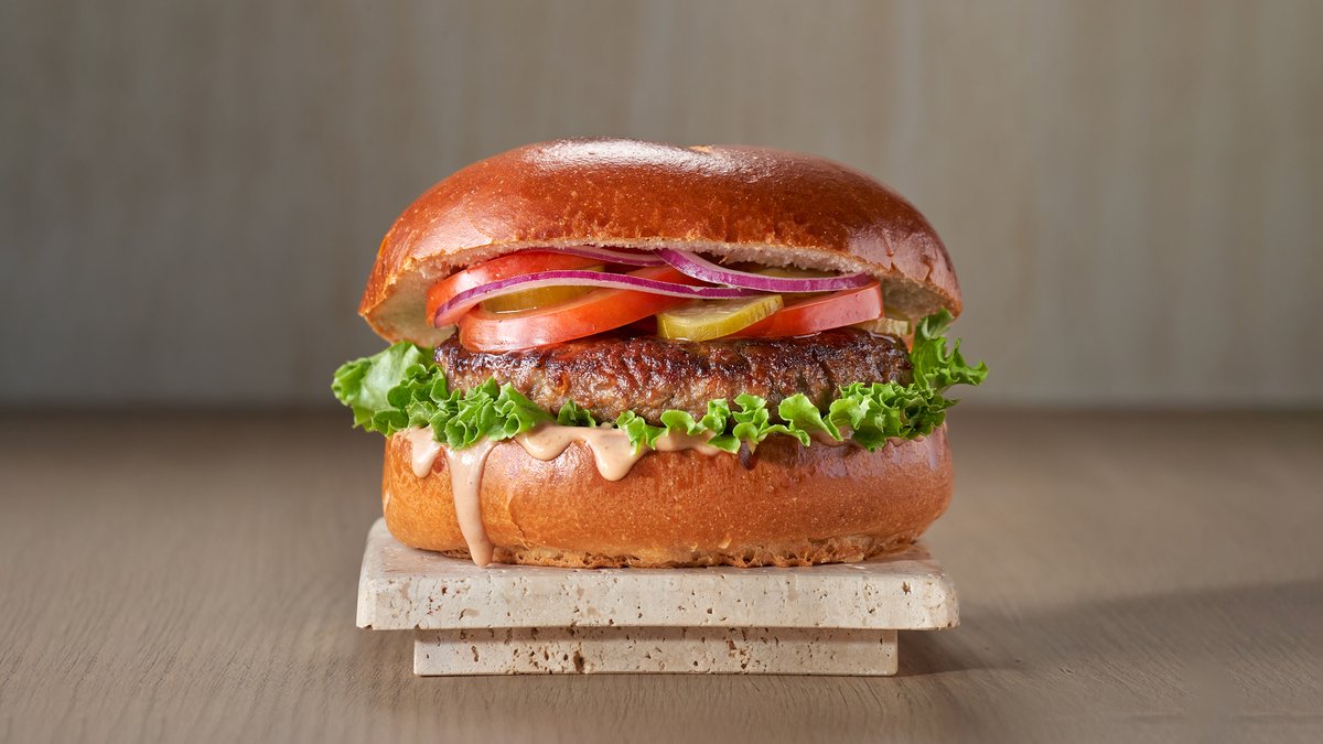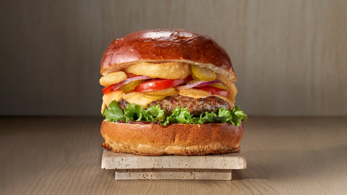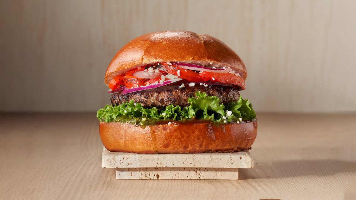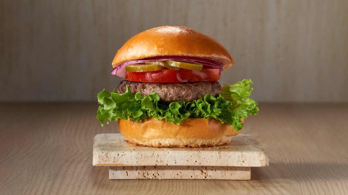קציצת בקר, בצל, עגבניה, מלפפון כבוש, חסה ורטבים בלחמניה