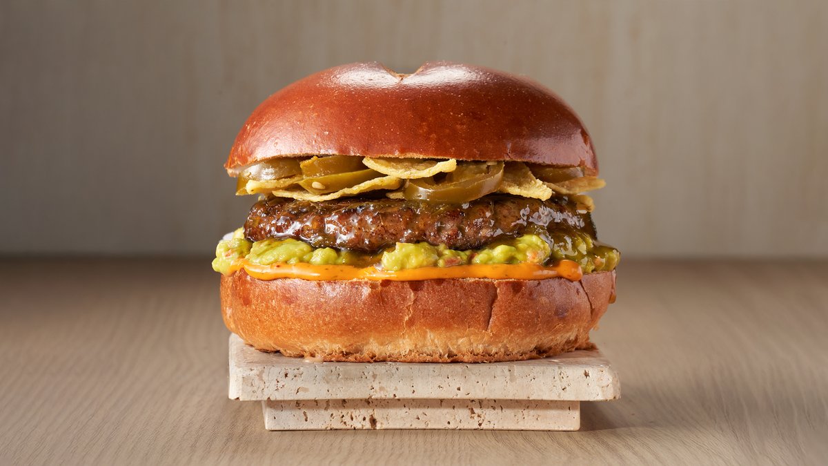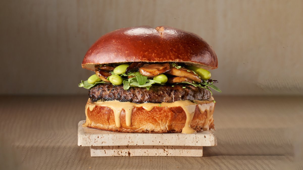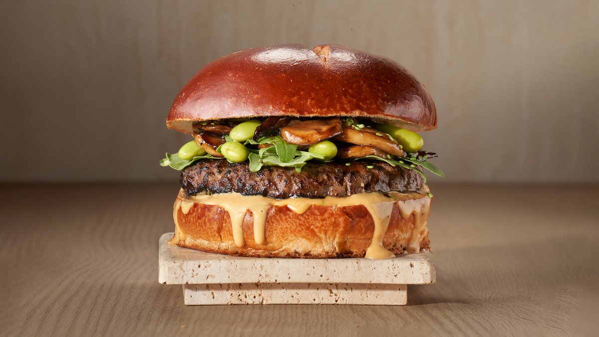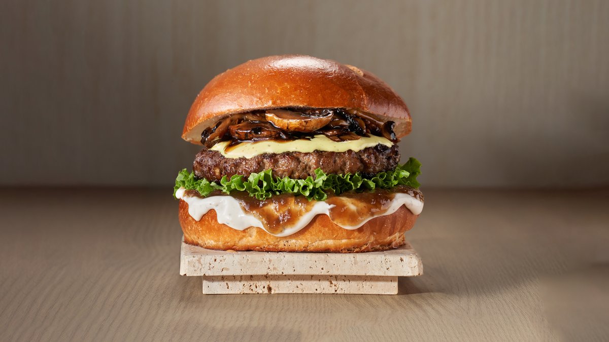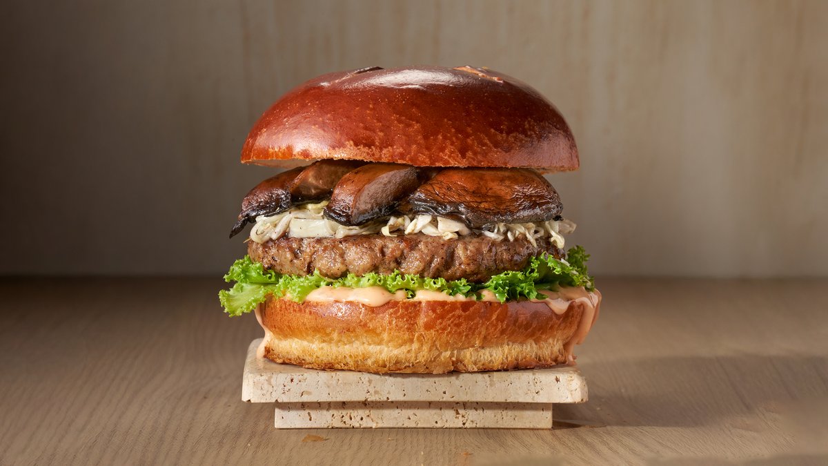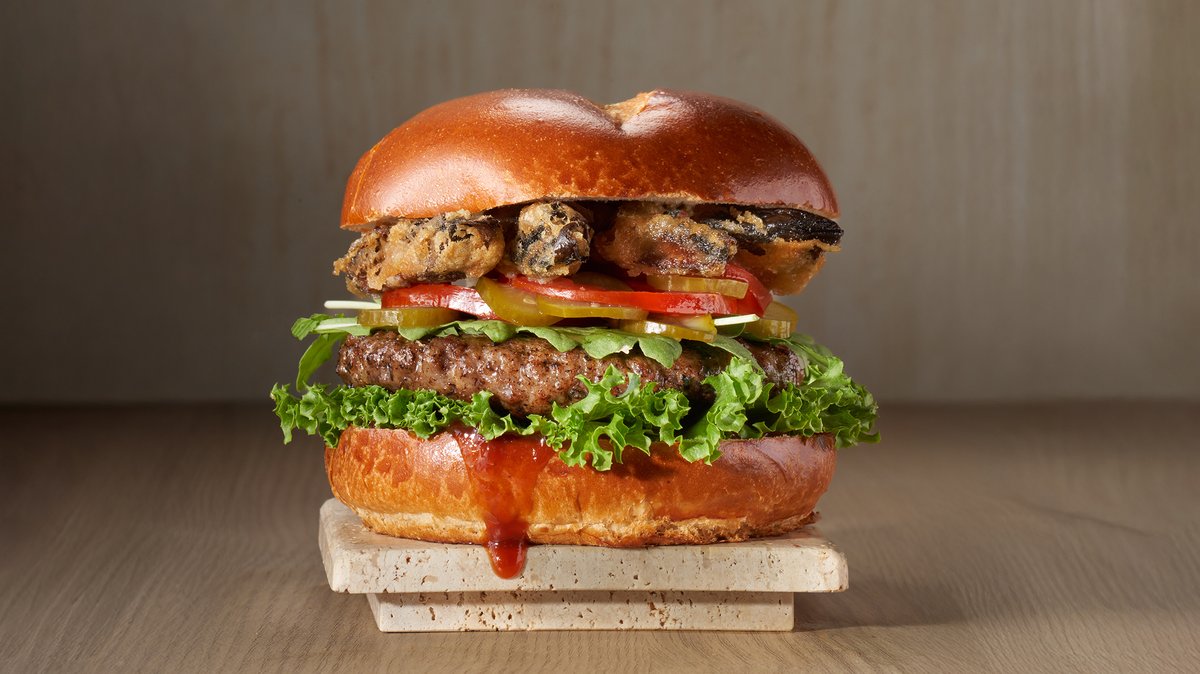 המבורגר טבעוני, חסה, ארוגלה, פטריות בטמפורה, ברביקיו, קטשופ, עגבניה ומלפפון כבוש
