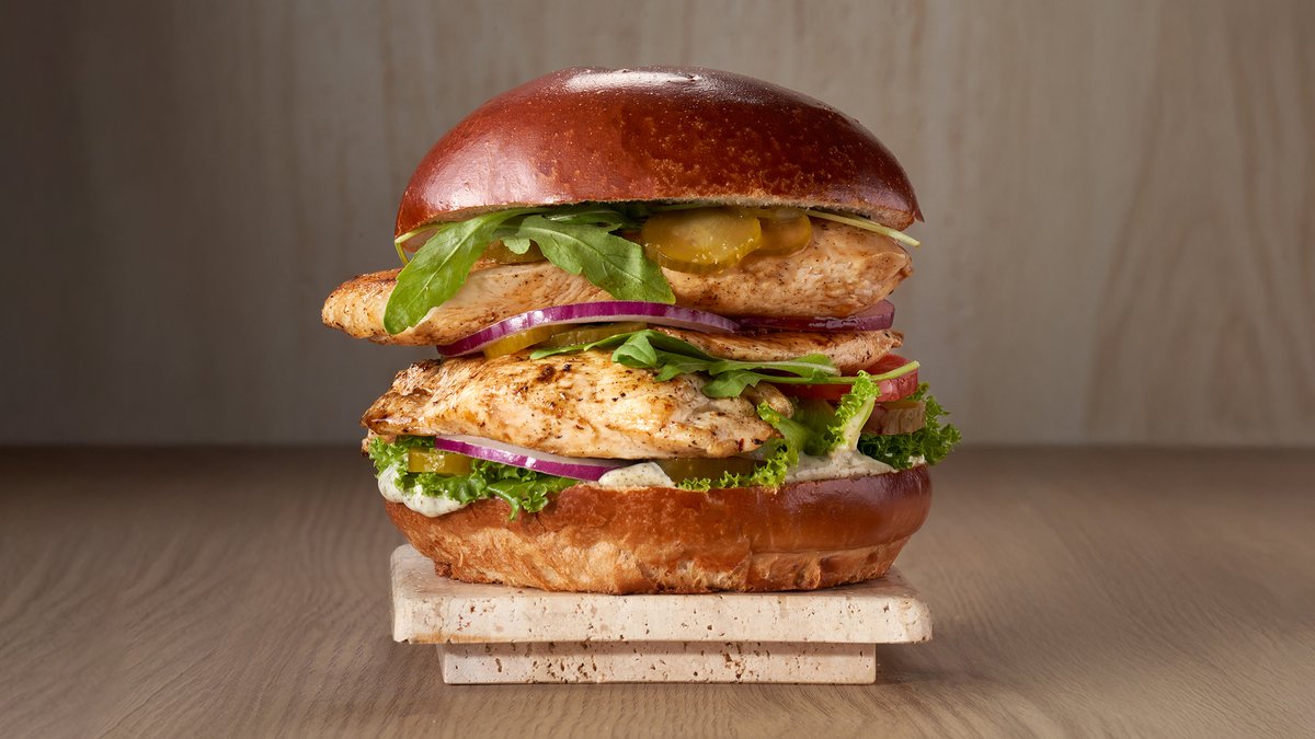 חזה עוף צרוב בפלנצ'ה, חסה, עגבניה, בצל סגול, מלפפון חמוץ, איולי שום זעתר וארוגלה