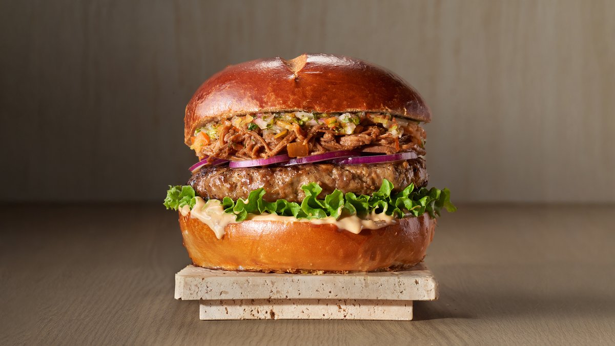 חסה, מיונז ברביקיו, צ'ימיצ'ורי, ריבת חלפניו, בצל סגול ואסאדו מפורק