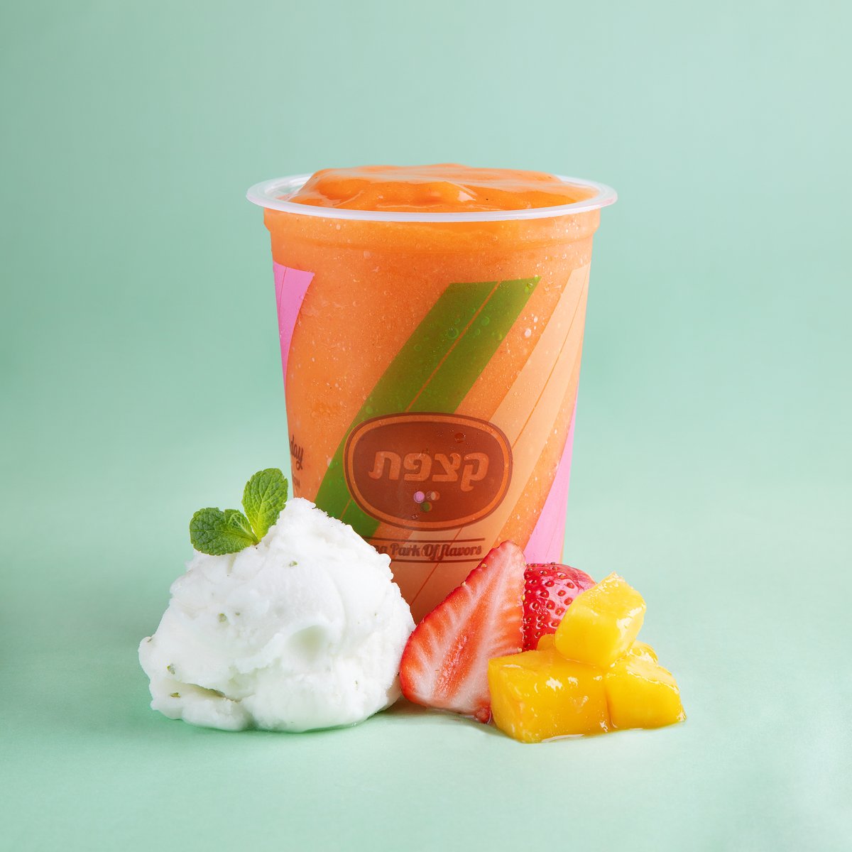 שייק על בסיס תפוזים, תות שדה, מנגו וגלידת סורבה לימונענע