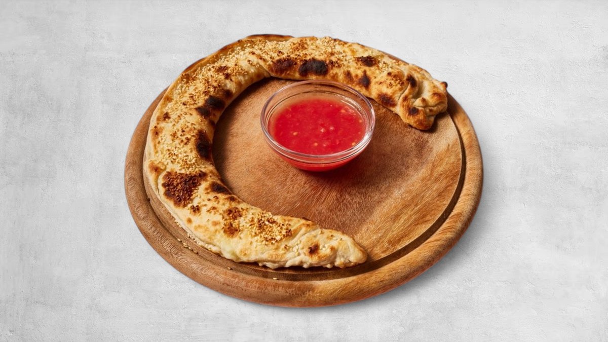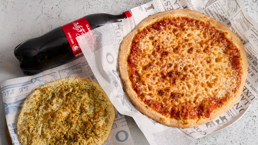 רוטב עגבניות ומוצרלה, לחם שום ושתייה גדולה