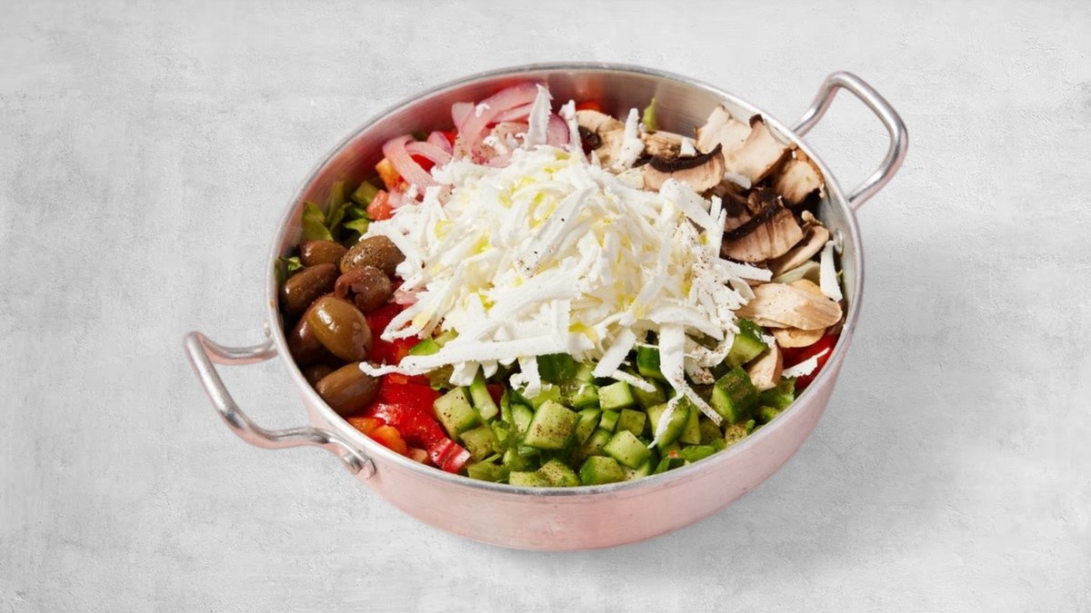 חסה, מלפפון, עגבניה, גמבה, זיתי קלמטה, בצל סגול, זיתים שחורים, פטריות טריות, תירס וביצה קשה
