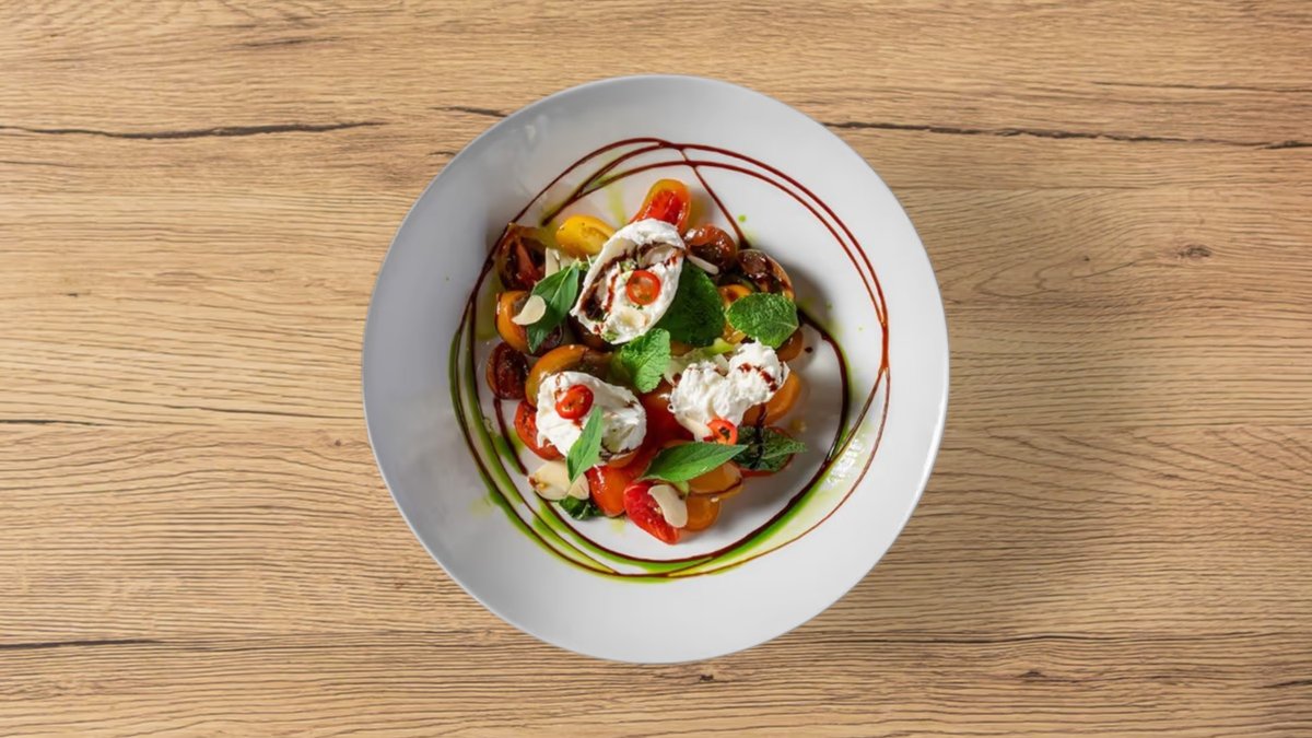 עגבניות שרי בצבעים, מוצרלה פרסקה, צ׳ילי ירוק, בזיליקום, זיתי קלמטה ובצל סגול