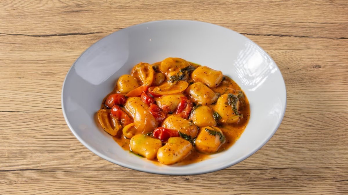 ניוקי שמנת פטריות, שום, עגבניות שרי, תרד וקוביות סלמון