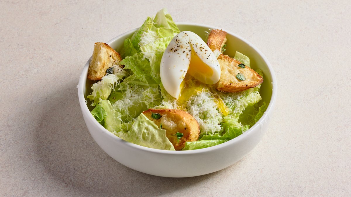 חסה פריכה, קרוטונים, ביצה רכה, ויניגרט קיסר ופרמזן מגורד