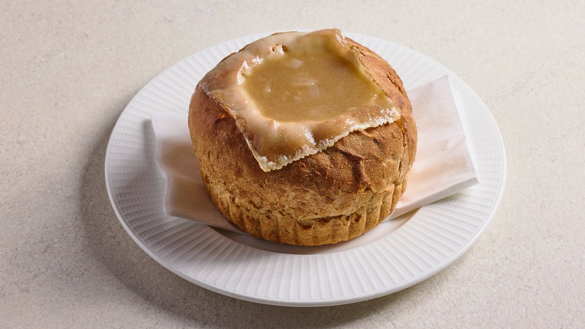 מוגש בקדרת לחם במעטה של גבינת גרוייר