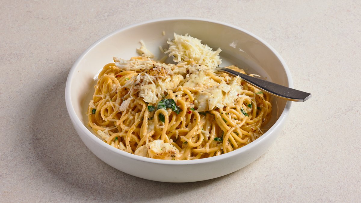 פסטה לינגוויני עם שרימפס, קלמארי, בייקון טלה, בצל מקורמל, עשבי תיבול, חלמון ביצה ופרמז׳ן