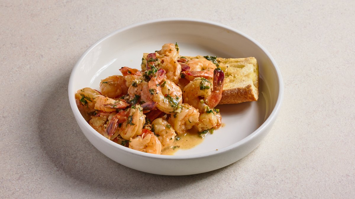 שרימפס בלאק טייגר, בחמאה, שום, יין לבן ועשבי תיבול מוגש עם פרוסת לחם