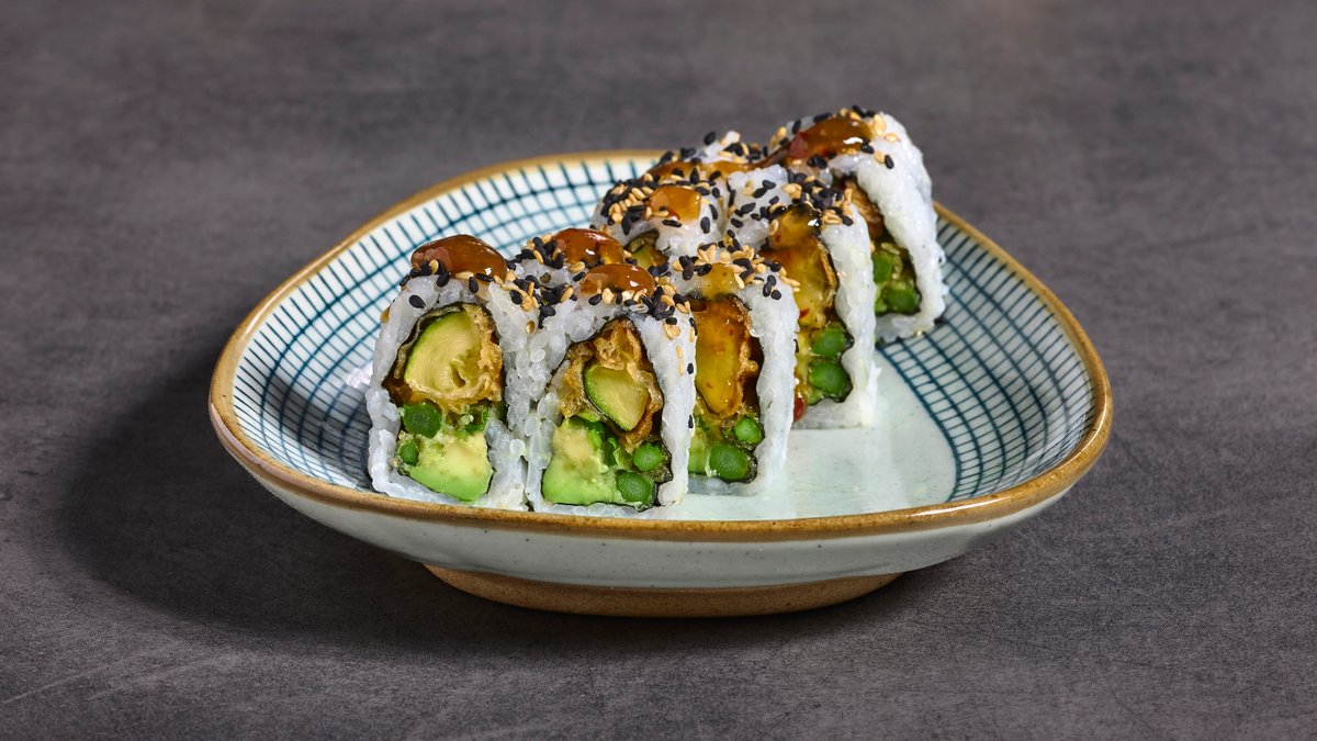 זוקיני טמפורה, אספרגוס טמפורה, אבוקדו ובצל ירוק במעטפת שומשום קלוי בזילוף קרם יוזו.