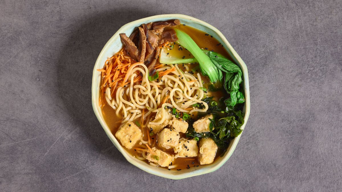 אטריות ראמן בציר ירקות - מיסו לבן עמוק, עם טופו מטוגן קלות, באקצ’וי, פטריות שיטאקה, גזר, אצות וואקמה, בצל ירוק ושומשום קלוי.