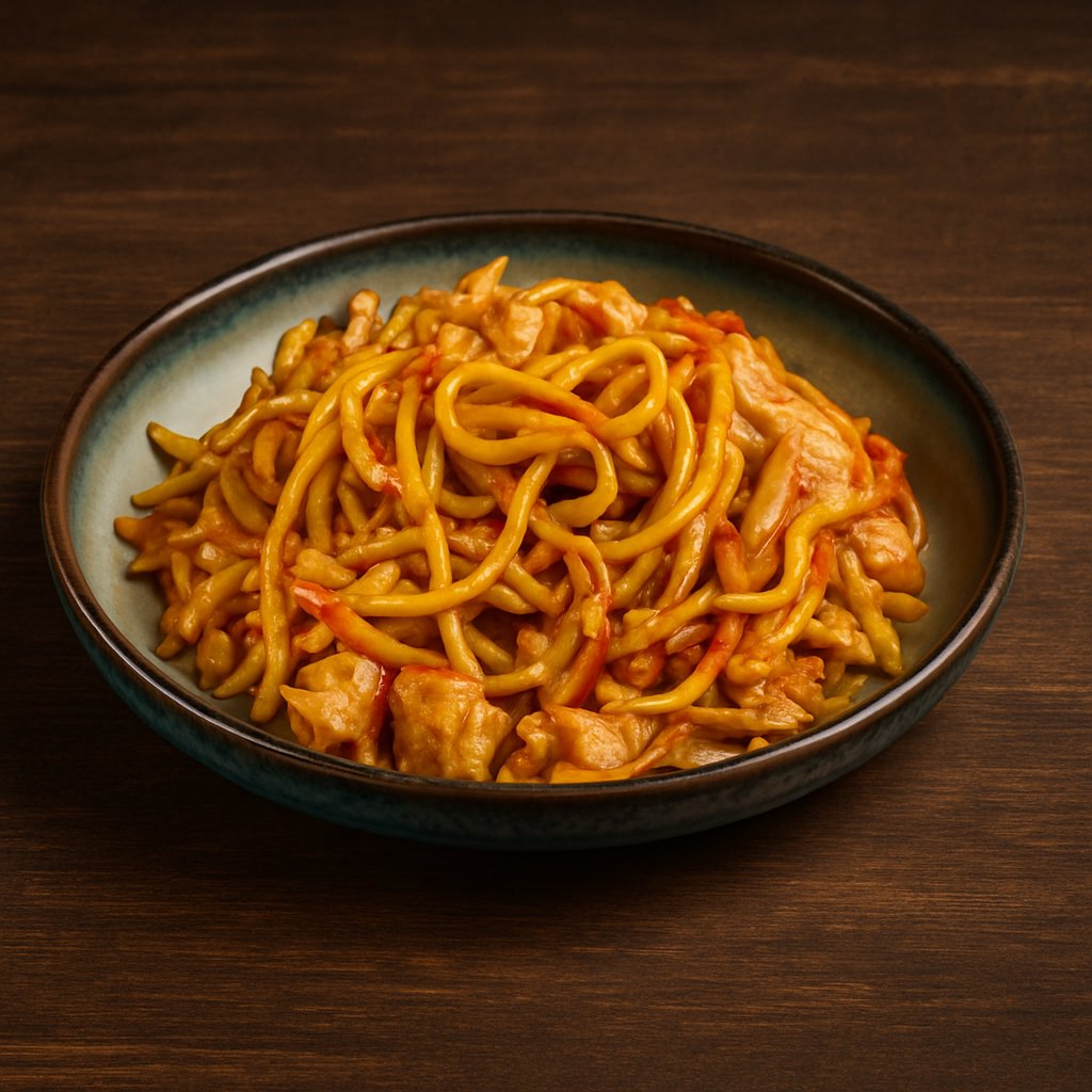 אטריות ביצים, גזר, בצל ירוק, כרוב ונתחי עוף ברוטב טריאקי שילדים אוהבים