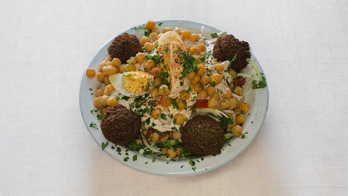 מלפפון , עגבנייה , כרוב , גרגרי חומוס , טחינה ,פטרוזליה. מתובל שמן זית ולימון, תוספת ביצה ושלושה כדורי פלאפל