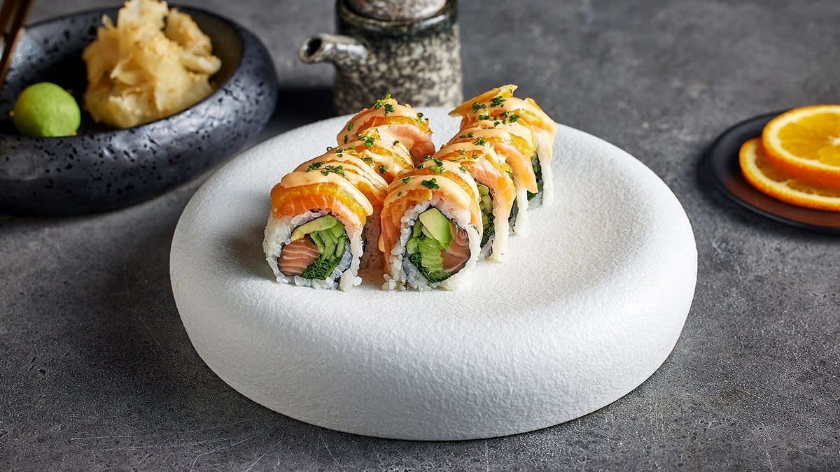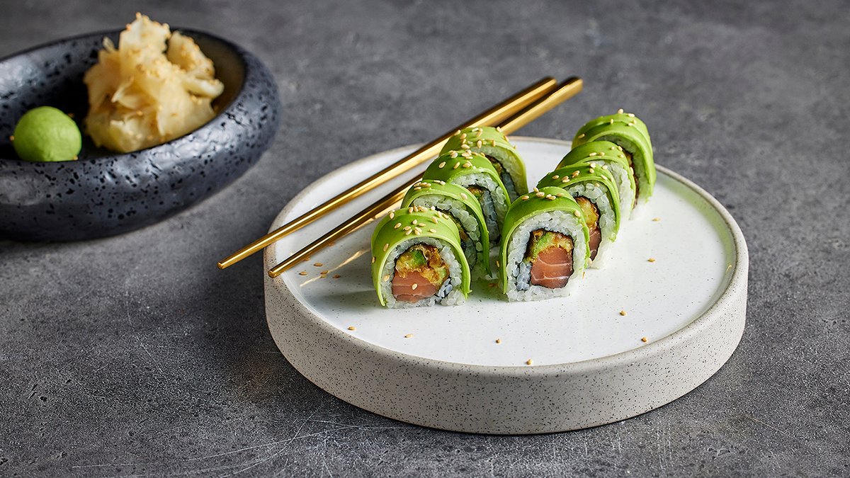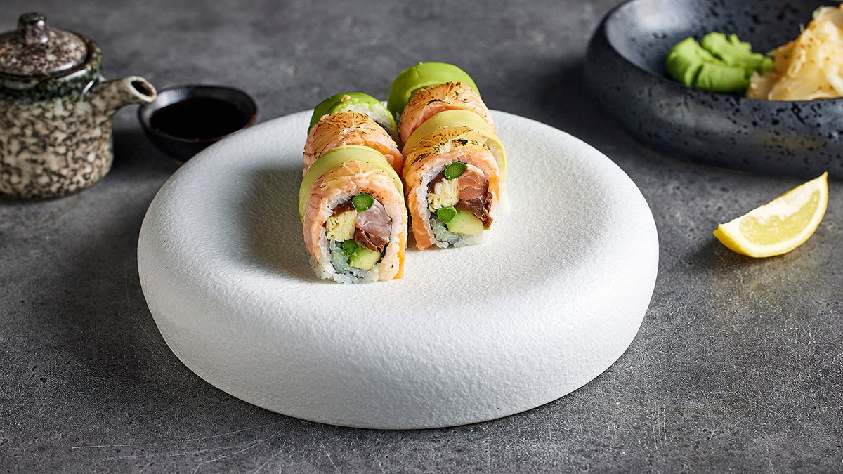 סלמון נא, אבוקדו, אושינקו, אספרגוס, מלפפון בציפוי סלמון ושומשום קלוי