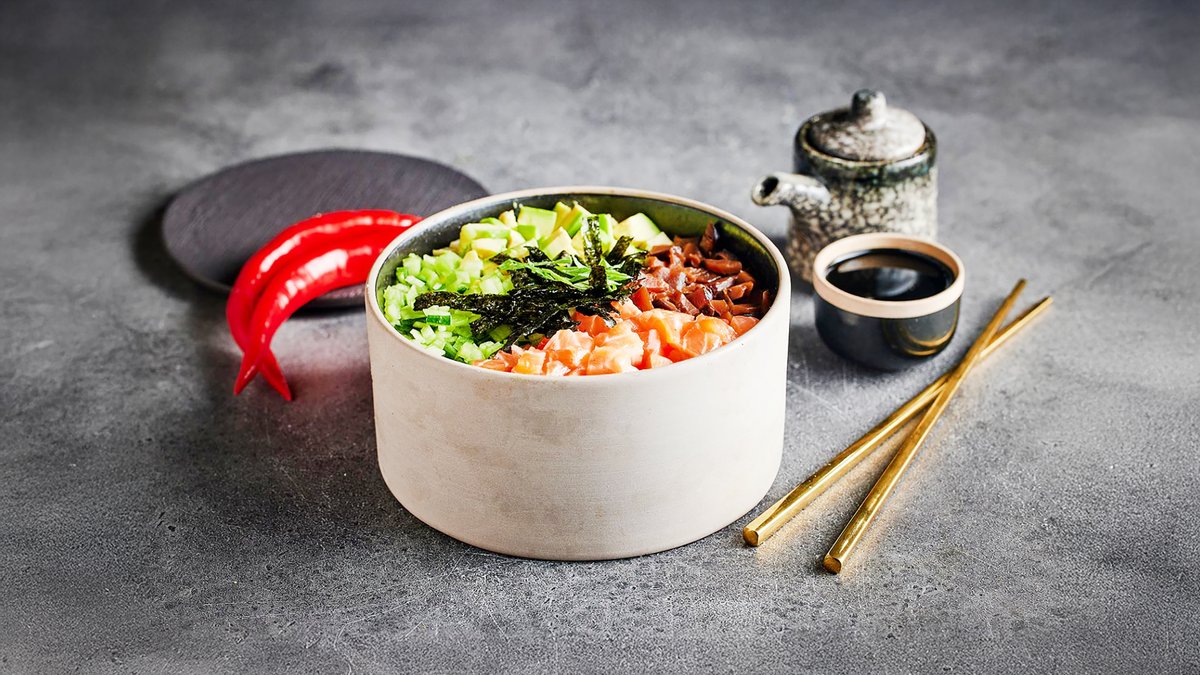טונה אדומה טרייה קצוצה ומתובלת, אבוקדו, בצל ירוק, כוסברה, שומשום קלוי, סויה וקרם שומשום על אורז בגריל