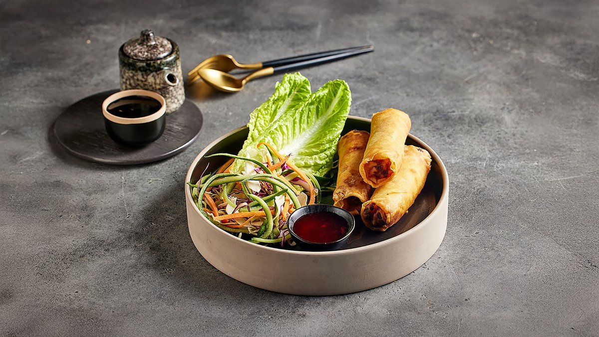 3 יח׳ בצק פילו ממולא כרוב, גזר, בצל ירוק ושעועית ירוקה מוגש עם רוטב חמוץ מתוק