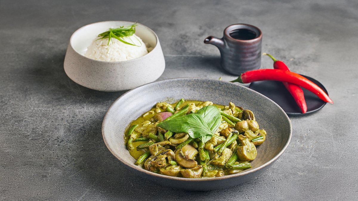 קארי אדום מסורתי, חלב קוקוס, שעועית, פלפלים, שאלוט, צ'ילי ותאי בזיל ליד אורז מאודה