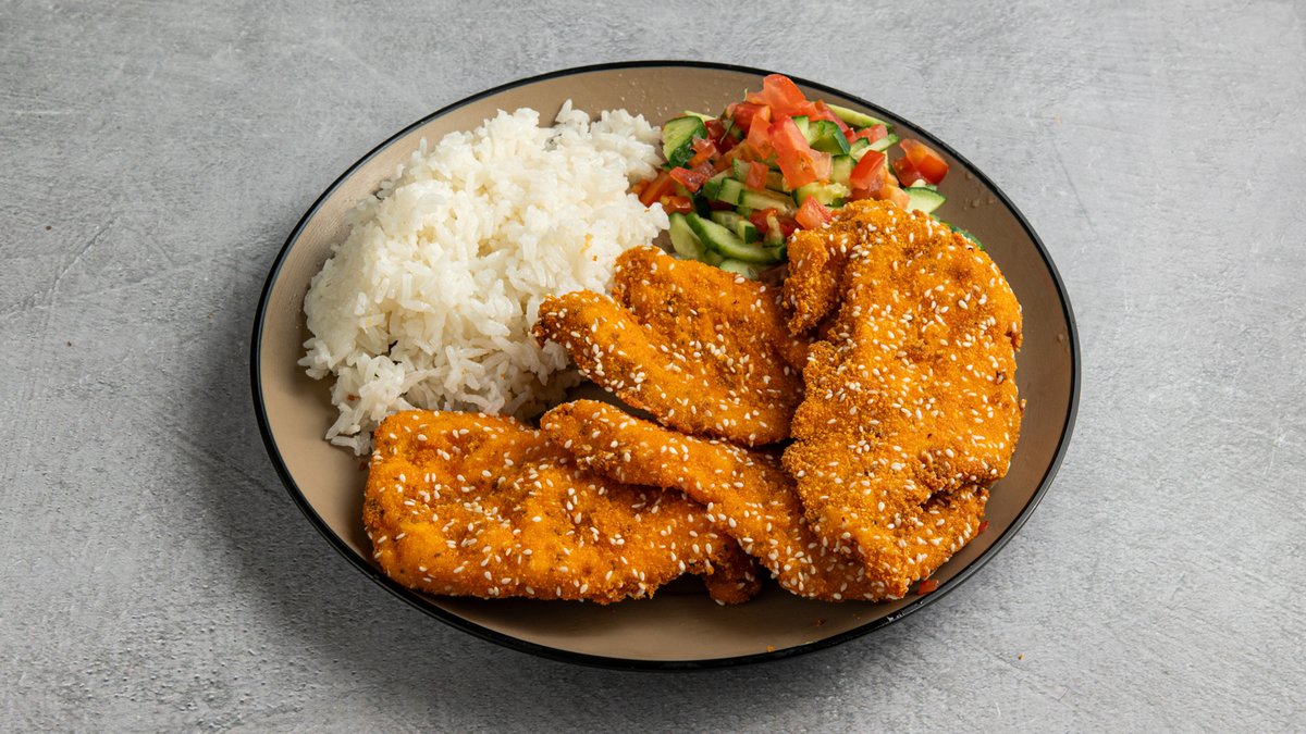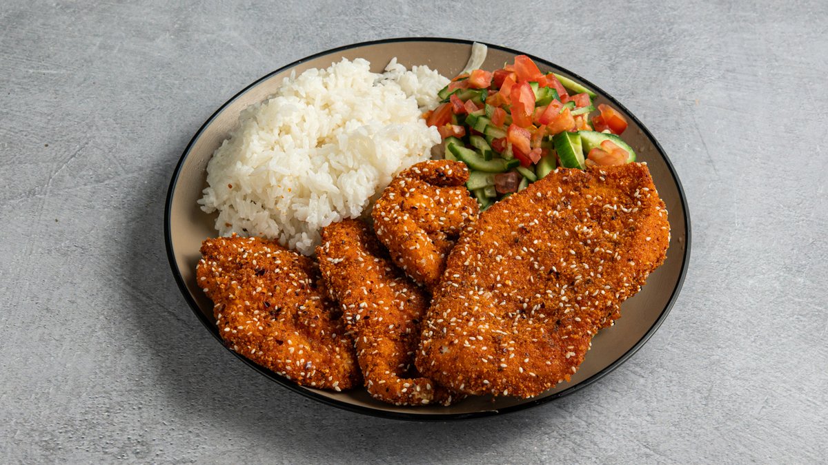שניצל מקסיקני מוגש עם סלטים ותוספות לבחירה